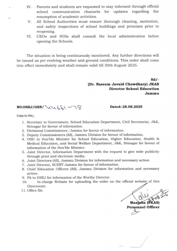 “In the interest of safety of students and staff, all schools in Jammu Division shall remain closed till August 30, 2025,” the directive reads.School heads have been directed to consider online classes, particularly for senior students, where infrastructure allows. They must also ensure cleaning and inspection of buildings before reopening.