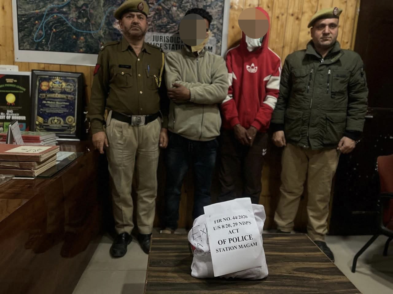 BUDGAM, April 14, 2026 :- In a significant breakthrough against local drug trafficking, the Magam Police intercepted a vehicle and arrested two individuals involved in the transport of illegal substances.
