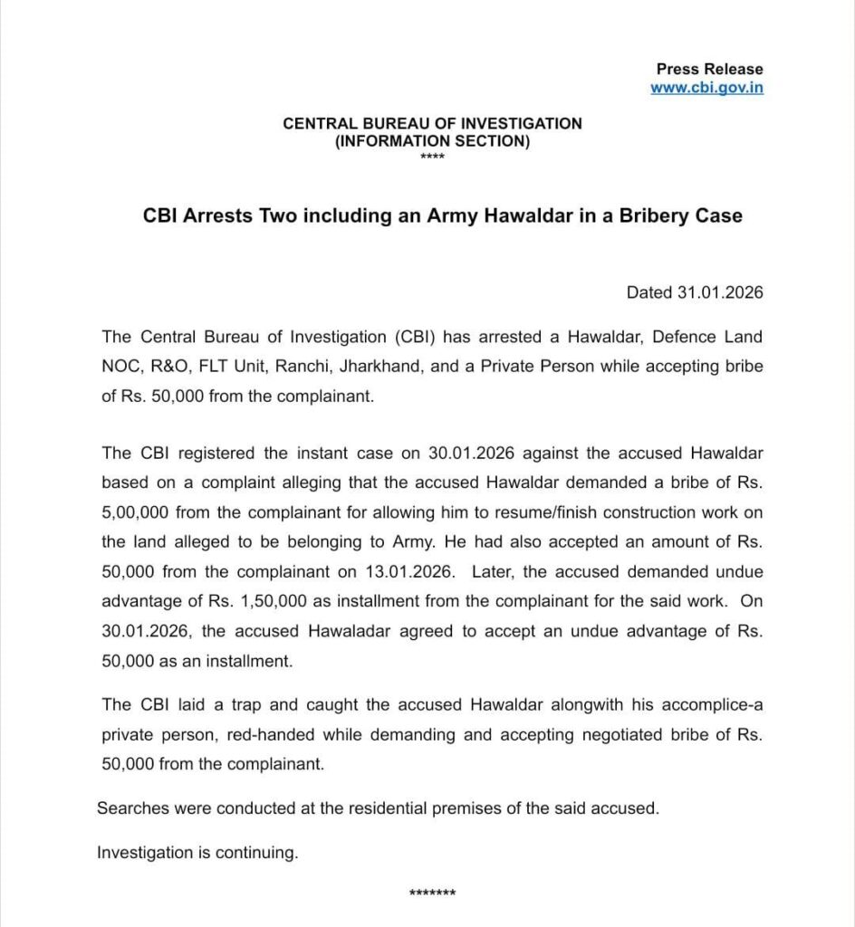 Ranchi, January 31, 2026: The Central Bureau of Investigation (CBI) has successfully apprehended an Army Hawaldar and a private individual in Ranchi, Jharkhand, for their involvement in a bribery case. The Hawaldar, stationed at the Defence Land NOC, R&O, FLT Unit, was caught red-handed alongside his accomplice while accepting an installment of Rs. 50,000 from a complainant.