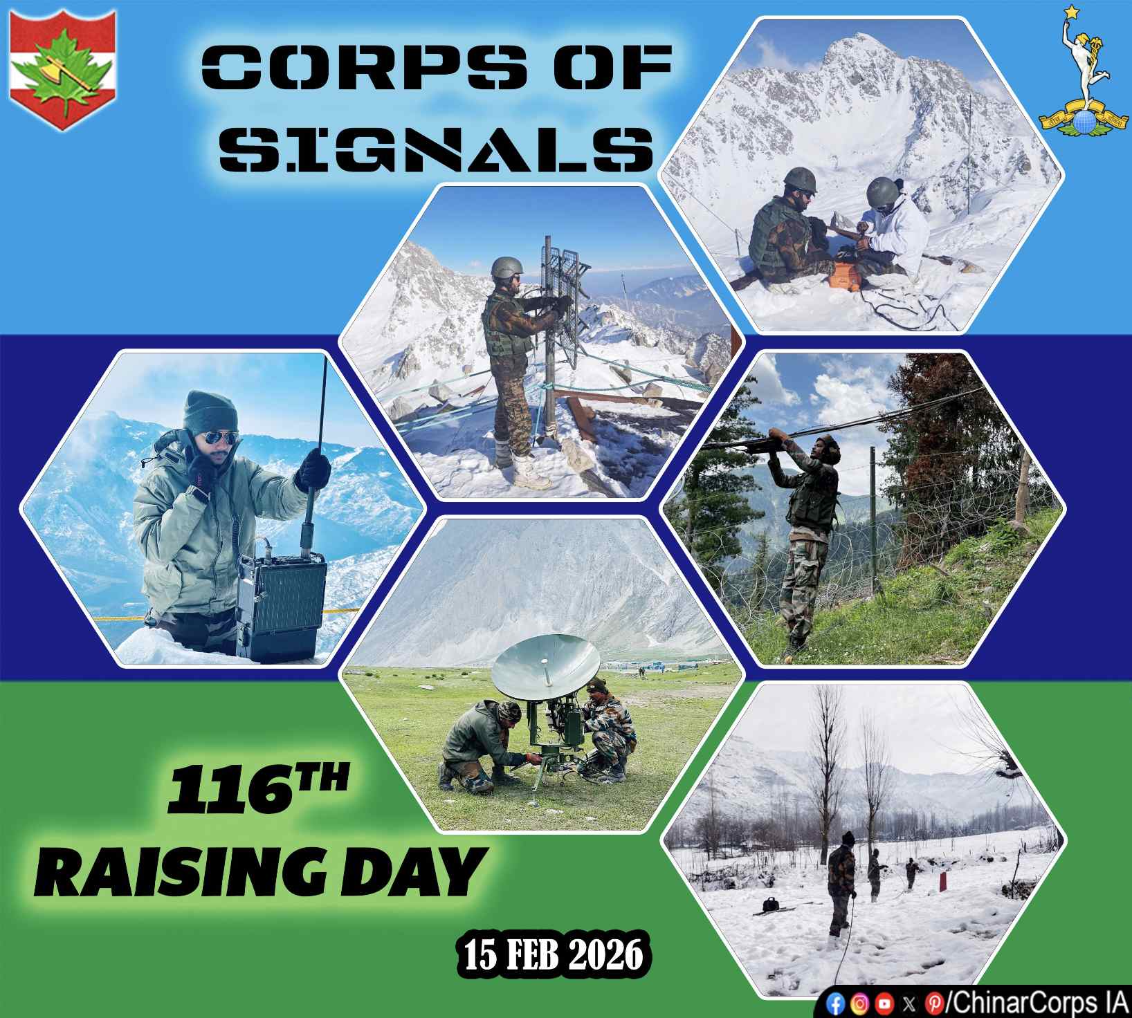 SRINAGAR, Feb 15, 2026 — On the auspicious occasion of the 116th Corps Day of Signals, the Chinar Corps extended its heartfelt greetings and best wishes to all ranks, veterans, and families of the Corps of Signals.