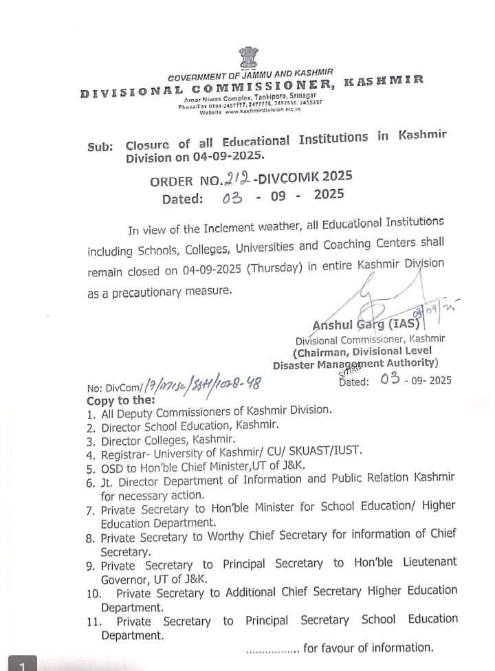 Jammu & Kashmir Closure of all educational institutions in the Kashmir Division on September 4, 2025 :- Div Com Kashmir Insight pulseSeptember 3, 2025