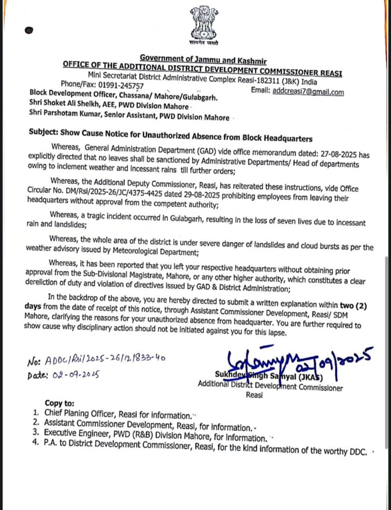 Reasi 03 September :- On the directions of Deputy Commissioner Reasi, Nidhi Malik, IAS, explanations have been sought from several officers and officials who were found unauthorizedly absent from duty amid the ongoing relief operations.