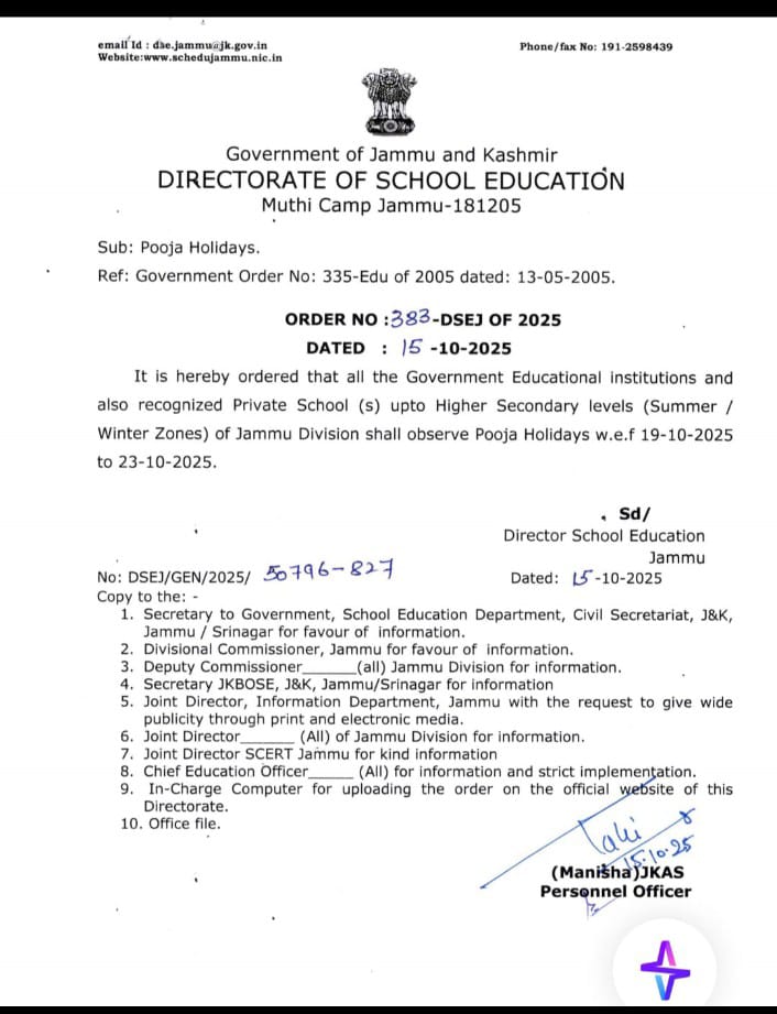 As Per the Order issued by DSEJ in which stated that the holidays will be observed from October 19 to October 23, 2025, covering institutions up to the Higher Secondary level in both Summer and Winter zones of the Jammu division.The directive will be applicable to all educational institutions under the jurisdiction of Jammu Division.
