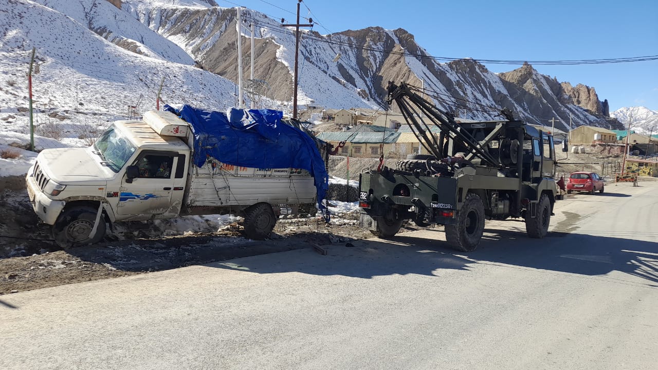 BHUDKHARBU, Feb 15, 2026 — Demonstrating rapid response and humanitarian commitment, troops from the Fire and Fury Corps deployed in the high-altitude region successfully recovered an overturned civil pickup vehicle near Bhudkharbu.