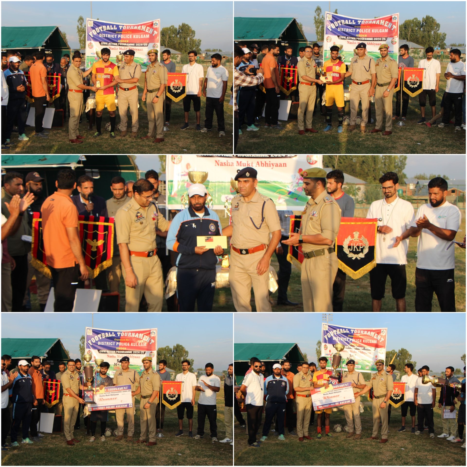 Kulgam October 03: Police in Kulgam successfully concluded an exhilarating football tournament organized under the aegis of Civic Action Programme (CAP) 2024-25, aimed at fostering sportsmanship, unity and community engagement.The grand finale, held at the Mini Stadium Kulgam, featured an exciting clash between FC Kulgam and Real Wanpora FC, in which Real Wanpora FC emerged victorious with a convincing 3-0 win.
