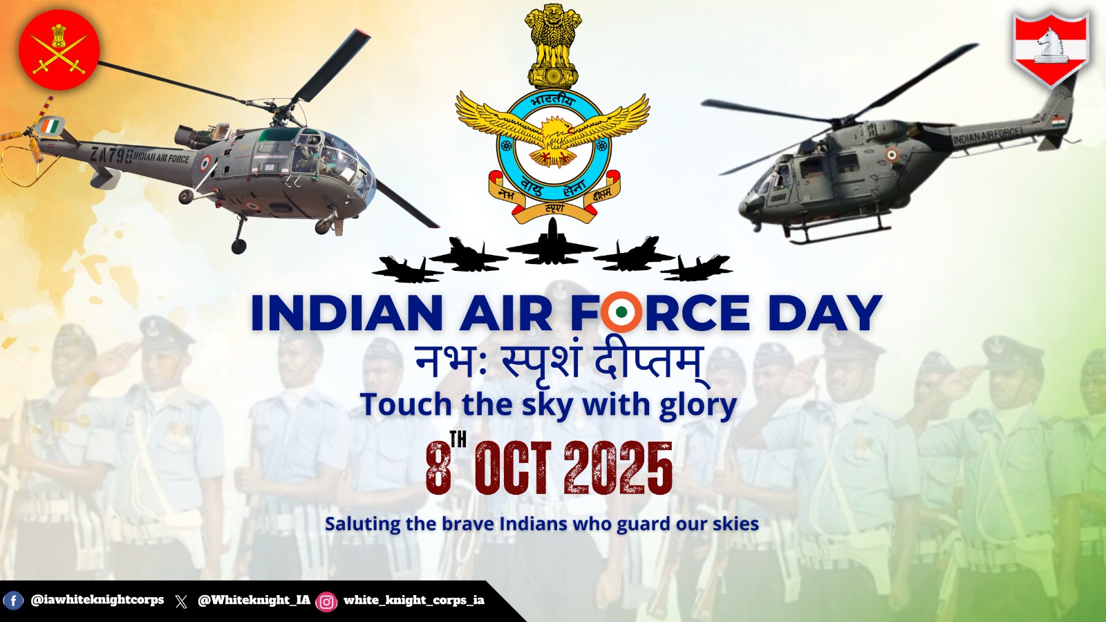 Jammu 08 October :- On the momentous occasion of Air Force Day2025, the GOC White Knight Corps and all ranks convey heartfelt greetings and best wishes to the Indian Air Force.