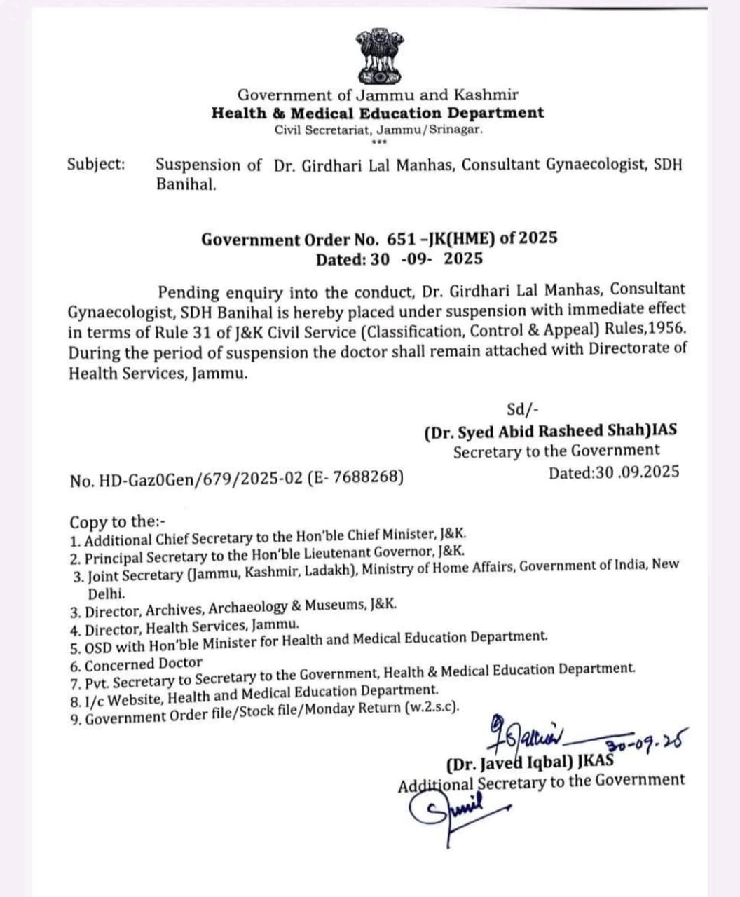 Later in the evening, the government issued an order suspending the accused doctor, Dr. Girdhari Lal Manhas, Consultant Gynaecologist at SDH Banihal. “Pending inquiry into his conduct, Dr. Manhas is hereby placed under suspension with immediate effect. During the suspension period, he shall remain attached with the Directorate of Health Services, Jammu,” reads Government Order No. 651-JK(HME) of 2025, signed by Dr. Syed Abid Rasheed Shah, IAS, Secretary to the Government.