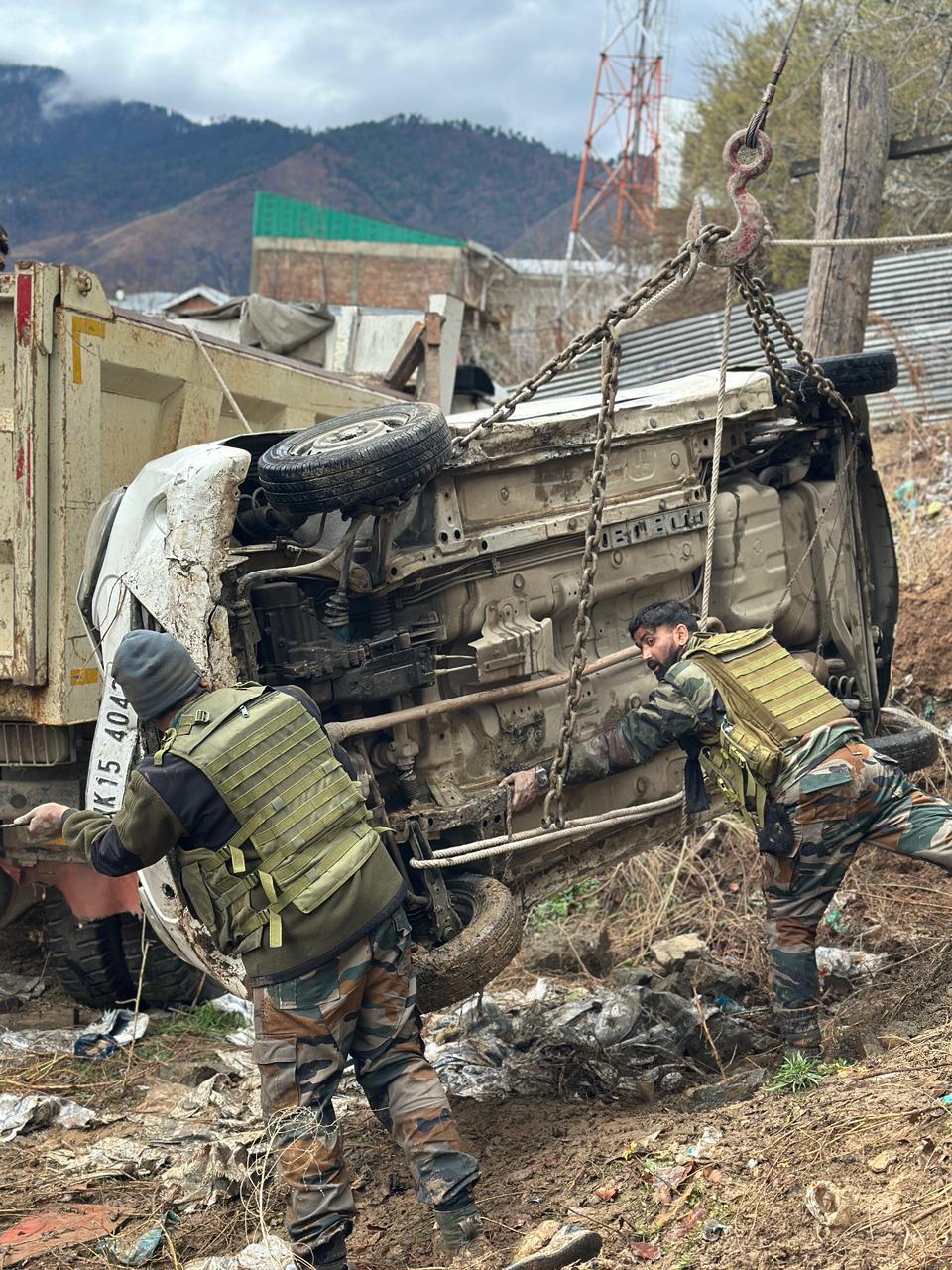 Bandipora March 12,2026 :- In a swift act of assistance, troops of Bandipora RR successfully recovered a civilian vehicle that had skidded off the road due to adverse weather conditions.