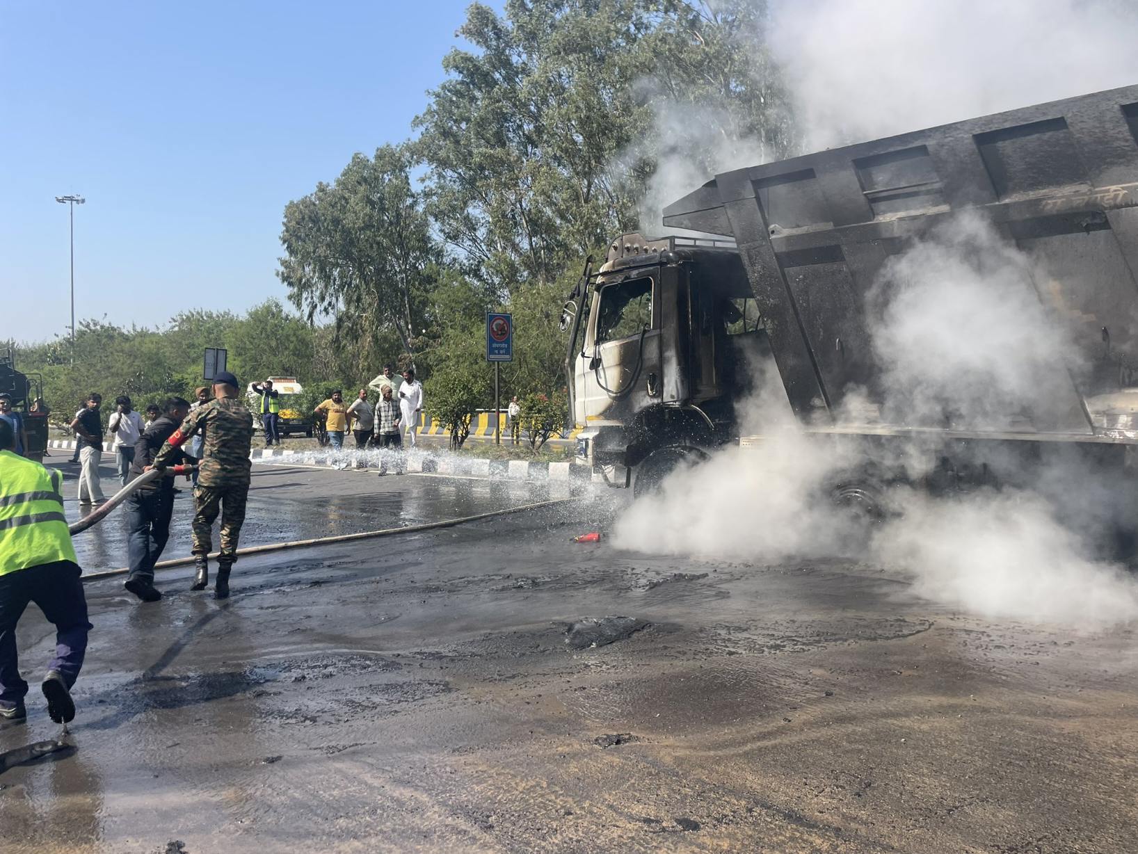 The crisis began when a truck transporting highly inflammable material suddenly caught fire, threatening lives and nearby infrastructure on the critical transit route. In an immediate reaction, the specialized fire crew from the 16 Engineer Regiment arrived at the scene and worked tirelessly to bring the intense blaze under control.