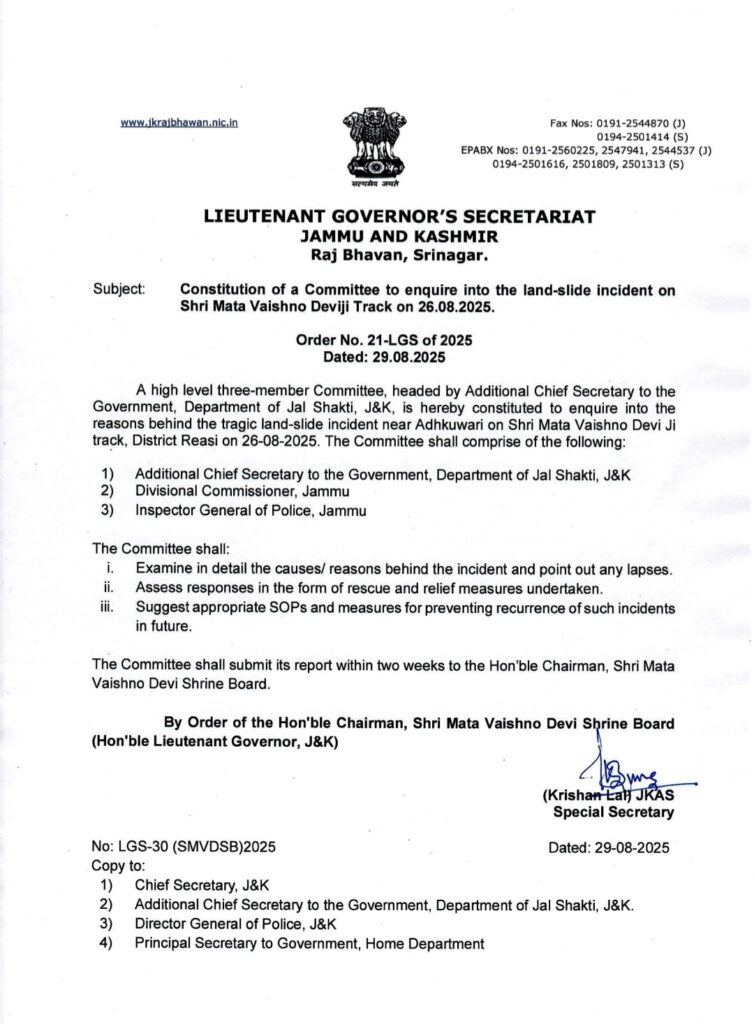 Katra 29 August :- The Lieutenant Governor’s Secretariat of Jammu and Kashmir has constituted a high-level three-member committee to investigate the tragic landslide incident that occurred on the Shri Mata Vaishno Devi Ji track near Adhkuwari in Reasi district on August 26,2025.