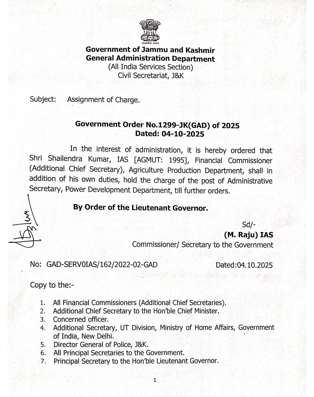 In the interest of administration, it is hereby ordered that Shailendra Kumar, IAS [AGMUT: 1995], Financial Commissioner (Additional Chief Secretary), Agriculture Production Department, shall in addition of his own duties, hold the charge of the post of Administrative Secretary, Power Development Department, till further orders