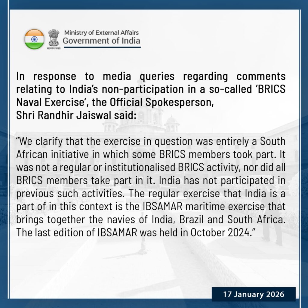 NEW DELHI, January 17, 2026 — The Ministry of External Affairs (MEA) today clarified India’s stance regarding its non-participation in a recent maritime drill frequently labeled by media outlets as a “BRICS Naval Exercise.”