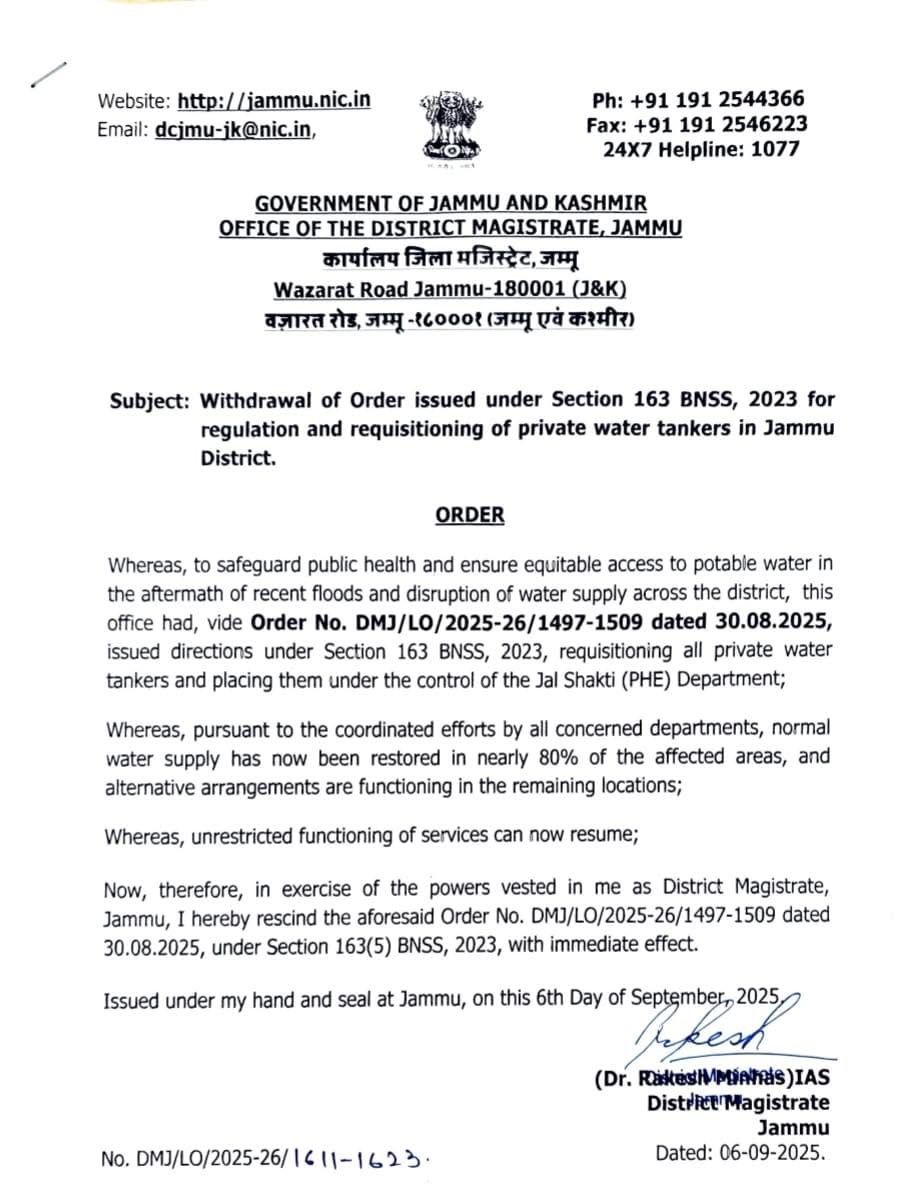 Jammu 06 September :- The Office of the District Magistrate, Jammu, has officially withdrawn its order requisitioning all private water tankers for public use, effective immediately.