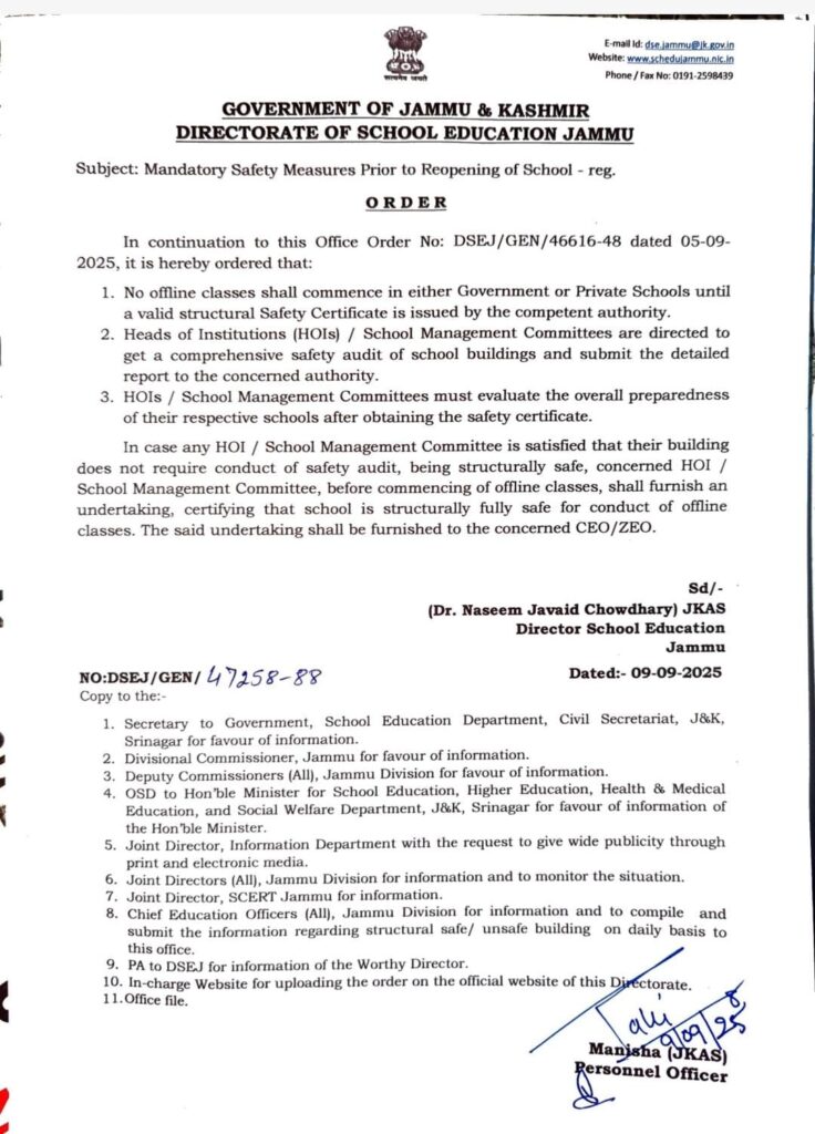 Jammu 09 September :- In a significant move to ensure student safety, the Directorate of School Education (DSE) Jammu has issued a strict order making it mandatory for all government and private schools to obtain a valid structural safety certificate from a competent authority before they can resume offline classes.