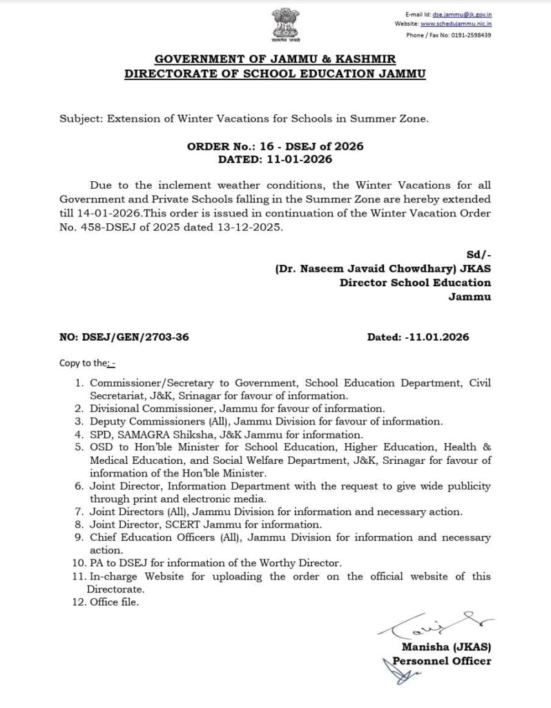 JAMMU, Jan 11 (2026) — The Directorate of School Education Jammu (DSEJ) has officially announced an extension of the winter vacations for all schools located in the Summer Zone of the Jammu division.