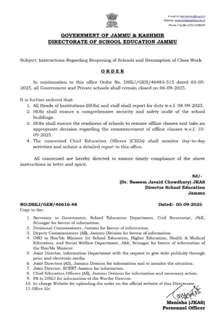 Jammu schools to remain closed on September 6, Staff to Report from September 8, appropriate decision on commencing offline classes from Wednesday, September 10, 2025 :- DSEJ