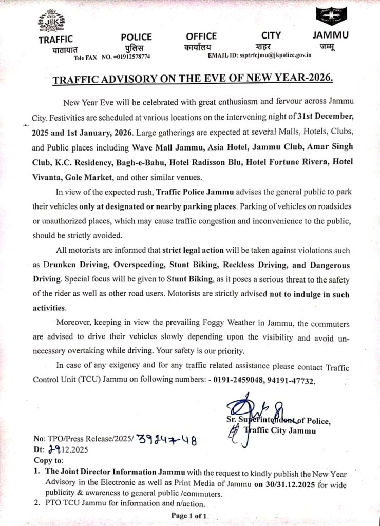 JAMMU, DECEMBER 29: In preparation for the upcoming New Year 2026 celebrations, the Traffic City Jammu office has released a detailed advisory to manage the significant influx of commuters and pedestrians expected on the night of December 31, 2025.