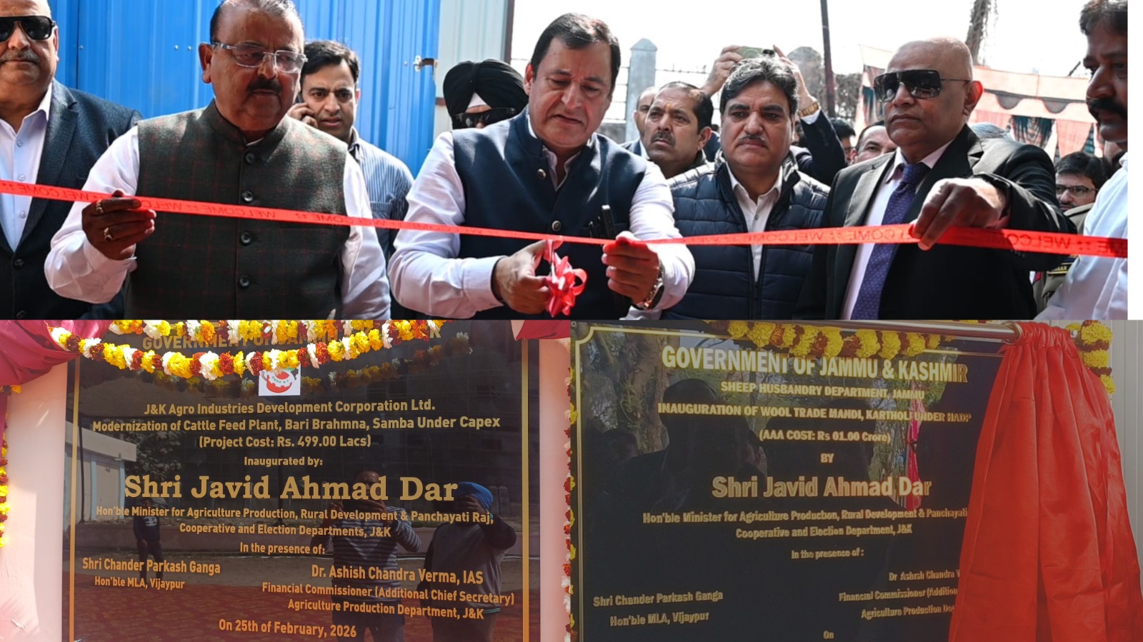 SAMBA, FEBRUARY 25, 2026: In a major move to revolutionize the agricultural and livestock landscape of Jammu and Kashmir, Minister for Agriculture Production, Rural Development, and Panchayati Raj, Javid Ahmad Dar, officially inaugurated a state-of-the-art modernized Cattle Feed Plant at Bari Brahmana and a newly developed Wool Trade Mandi at Kartholi.