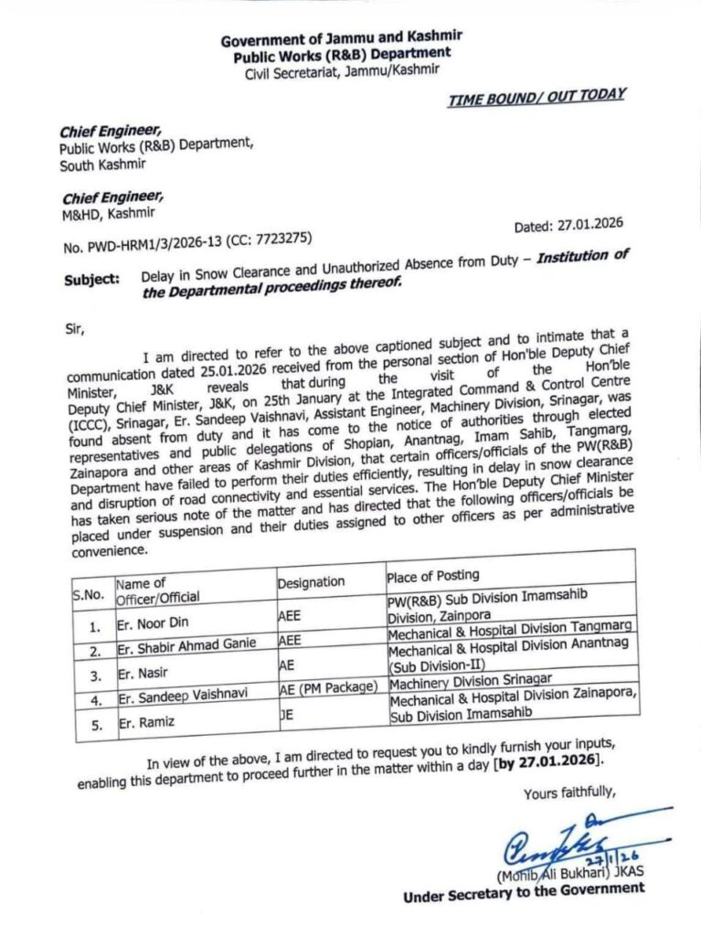 Srinagar, January 27, 2026: Following a high-level review of winter preparedness and road connectivity, the Government of Jammu and Kashmir’s Public Works (R&B) Department has ordered the immediate suspension of five engineers for dereliction of duty and unauthorized absence.
