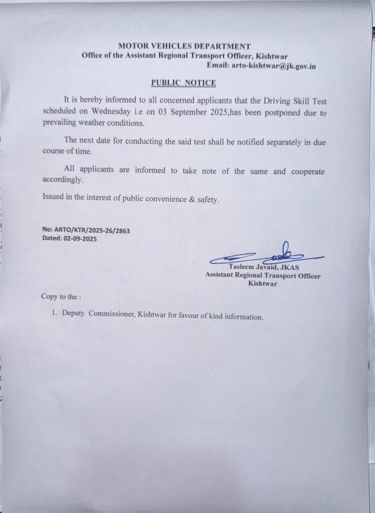 Kishtwar 02 September :- The Office of the Assistant Regional Transport Officer (ARTO), Kishtwar, has announced the postponement of all driving skill tests scheduled for Wednesday, 03 September 2025.