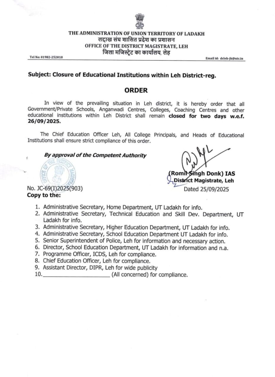Jammu & Kashmir Leh: All government and private schools, colleges, coaching centers and other educational institutions in Leh shall remain closed for two days w.e.f. September 26, in view of the prevailing situation. Insight pulseSeptember 25, 2025