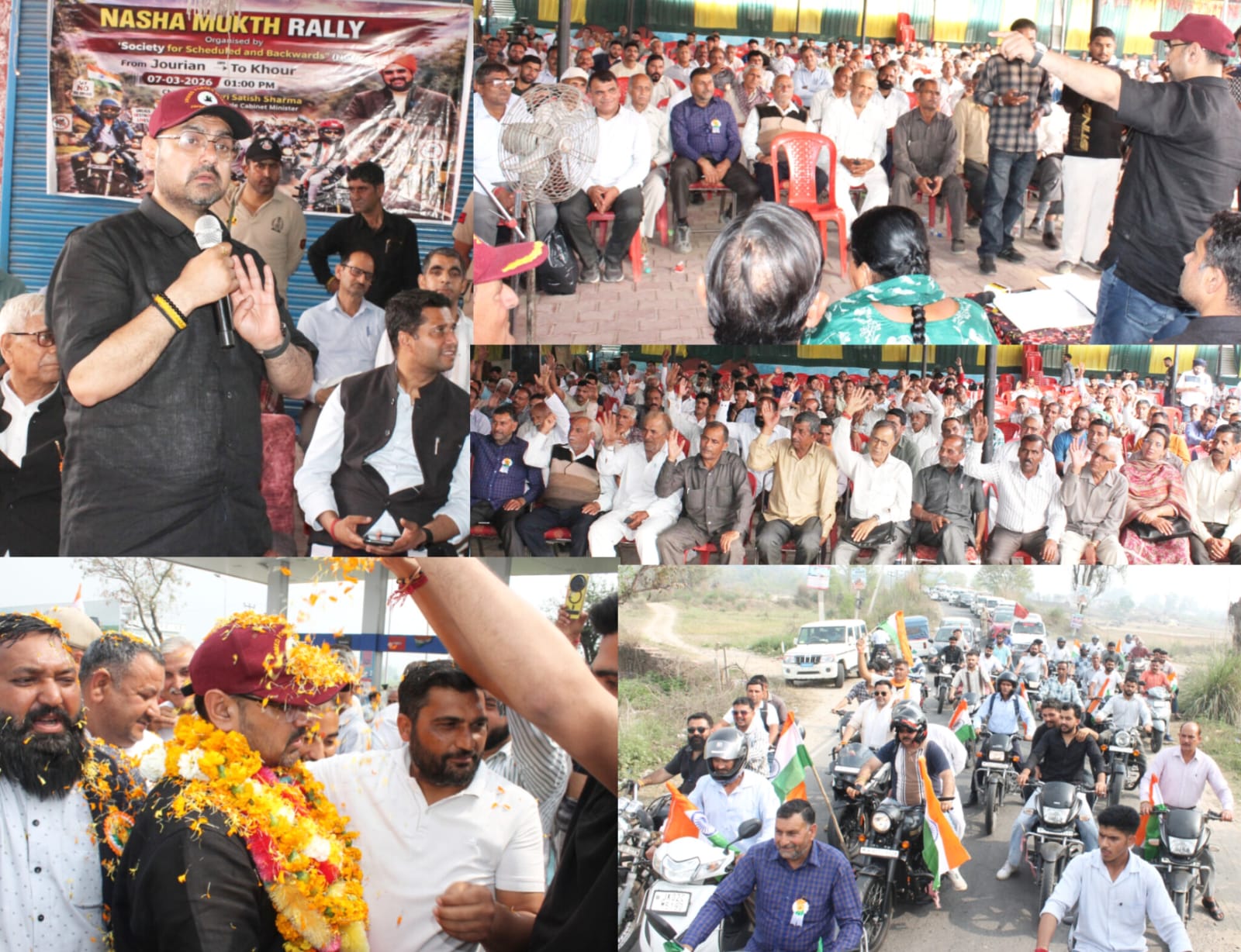 JAMMU, MARCH 07, 2026 — In a bold push to foster a drug-free society, the Minister for Food, Civil Supplies & Consumer Affairs, IT, Transport, Youth Services & Sports, and Science & Technology, Satish Sharma, officially flagged off a high-energy “Nasha Mukt” (Drug-Free) motorcycle rally from Jourian to Khour today.