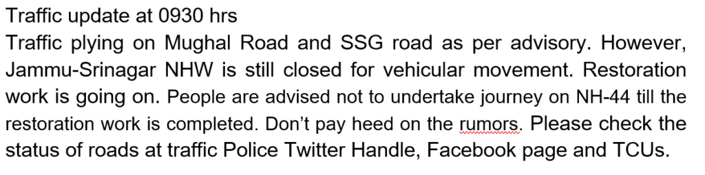 Jammu 05 September :- As of 0930 hours today, Jammu and Kashmir Traffic authorities have issued a crucial update for commuters, confirming that vehicular movement is proceeding as per advisory on both the Mughal Road and the SSG Road. This provides a vital alternative for connectivity in the region.