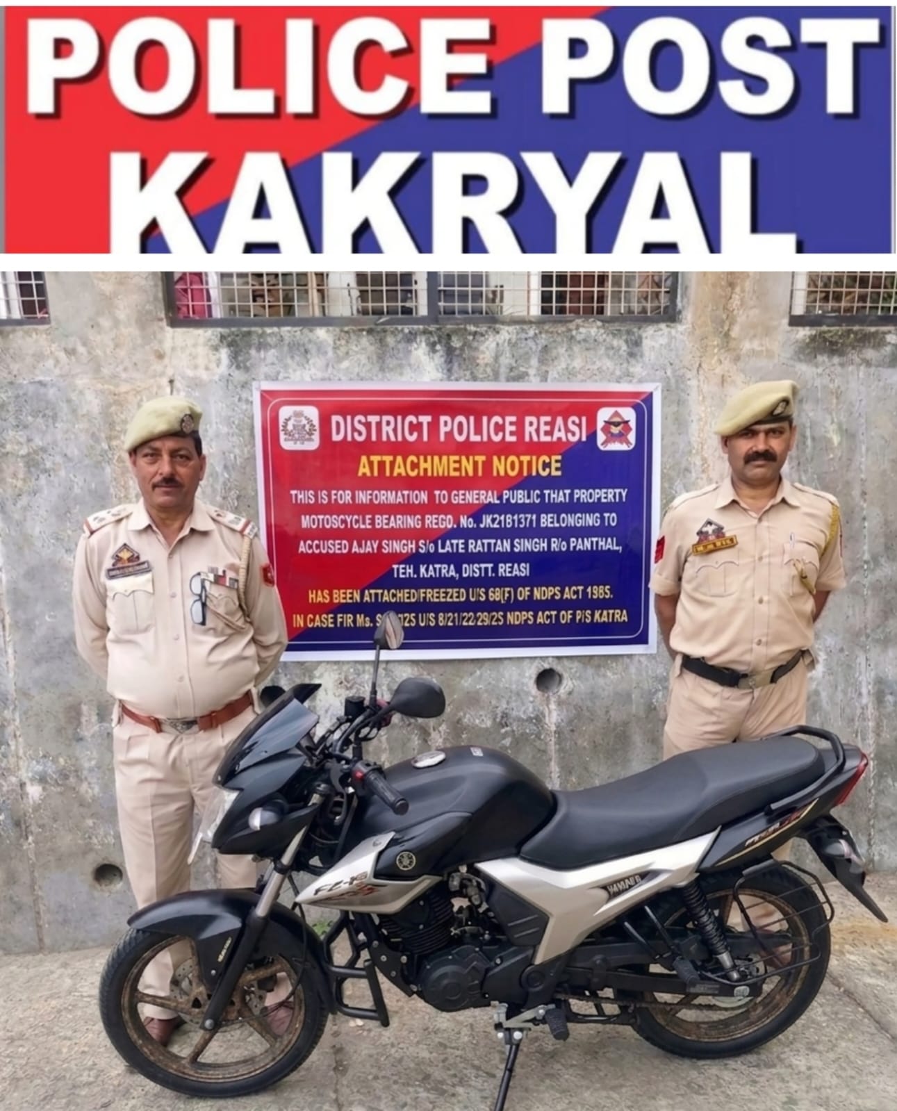 Under the supervision of SSP Mukund Tibrewal, authorities seized a motorcycle belonging to Ajay Singh, a resident of Panthal, Katra, who has been identified as a habitual offender. The attachment was carried out under Section 68-F of the NDPS Act and is linked to a 2025 criminal case registered at the Katra Police Station.