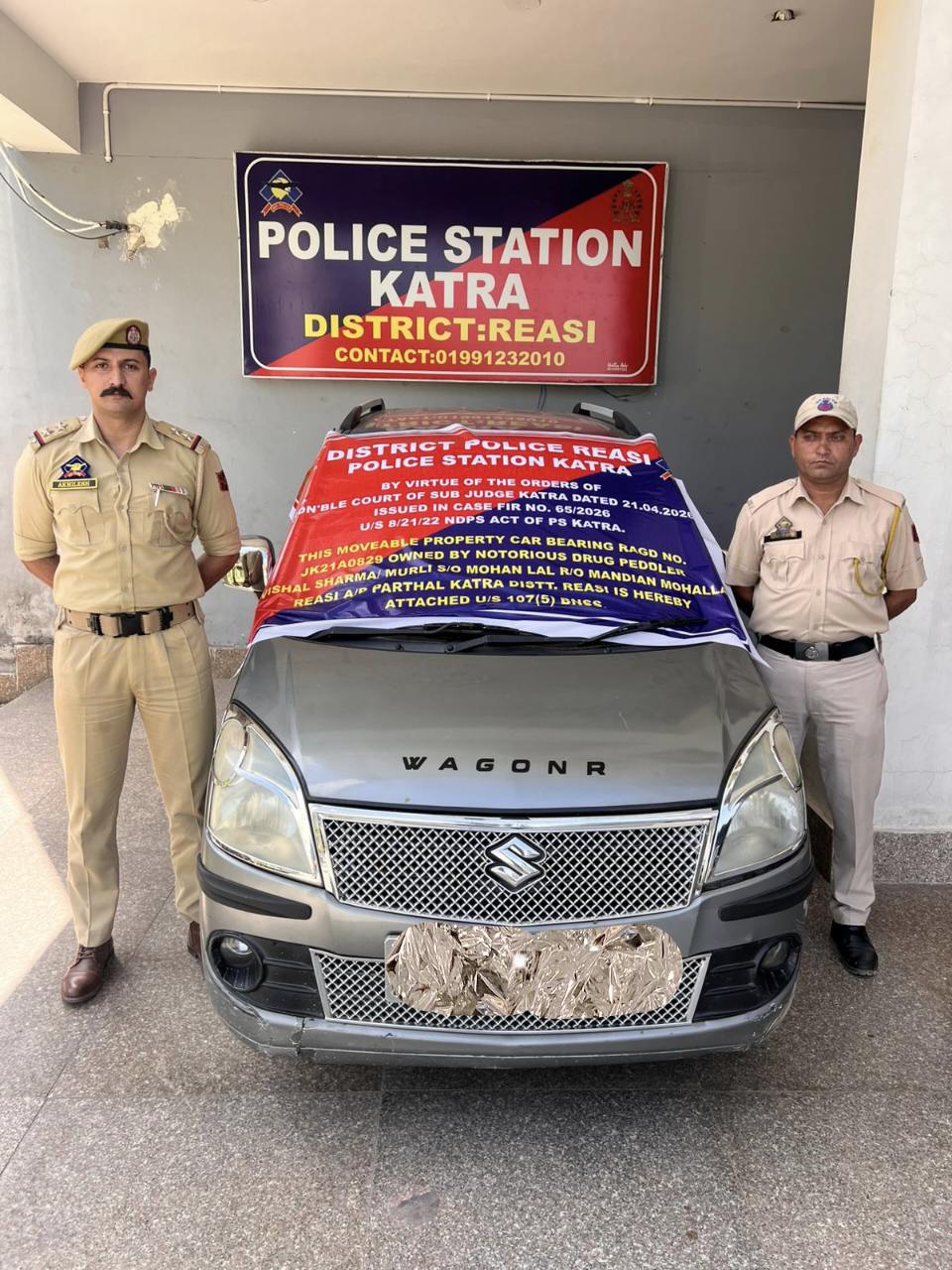 The operation, conducted under the leadership of SSP Mukund Tibrewal, IPS, targeted property believed to be illegally acquired through the proceeds of narcotics trafficking. The vehicle, registered as JK21A-0829, was seized following an order from the Court of Sub Judge Katra under Section 107(5) of the BNSS.