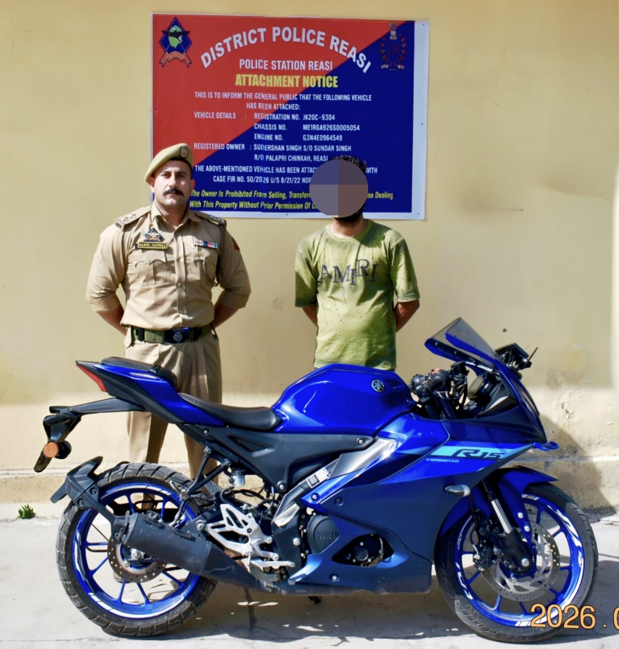 The action stemmed from an investigation into FIR number 50/2026, which led authorities to a motorcycle owned by the accused, Sudarshan Singh.