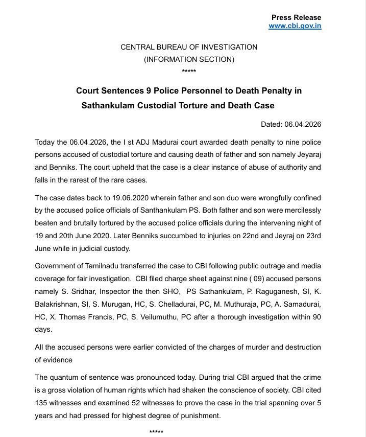 MADURAI, April 6, 2026 – In a landmark judgment, the 1st Additional District and Sessions Court (ADJ) in Madurai has awarded the death penalty to nine police personnel for the custodial torture and subsequent deaths of a father and son, P. Jeyaraj and J. Benniks.