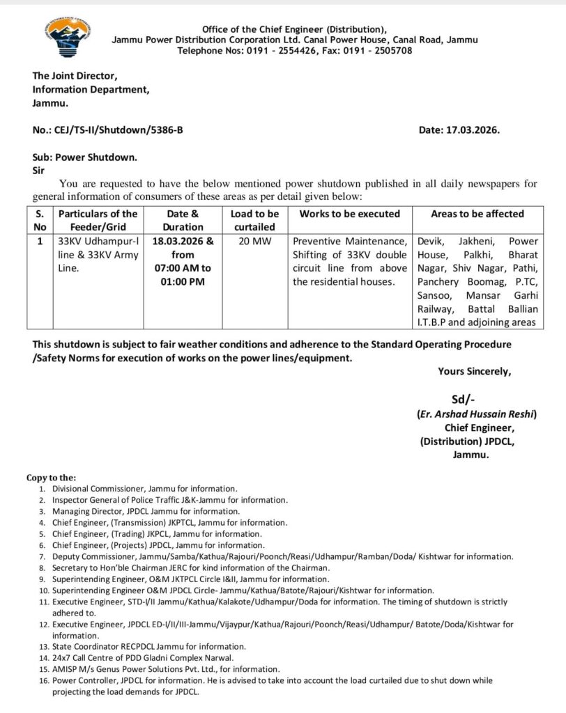 JAMMU March 17, 2026 — The Chief Engineer (Distribution) of the Jammu Power Distribution Corporation Limited (JPDCL), Jammu, has issued a formal notice regarding a scheduled power shutdown affecting several key areas on Wednesday, March 18.