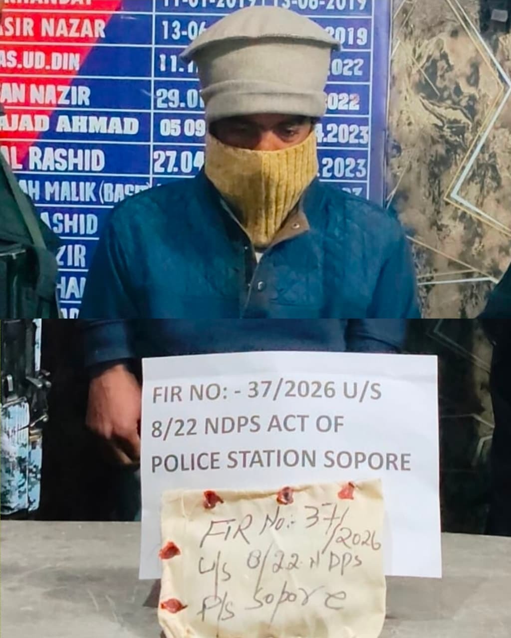 SOPORE, February 23, 2026 — In a persistent drive to eradicate the drug menace and safeguard the local community, the Jammu and Kashmir Police successfully apprehended a drug peddler in the Sopore region today, recovering a significant quantity of psychotropic substances.