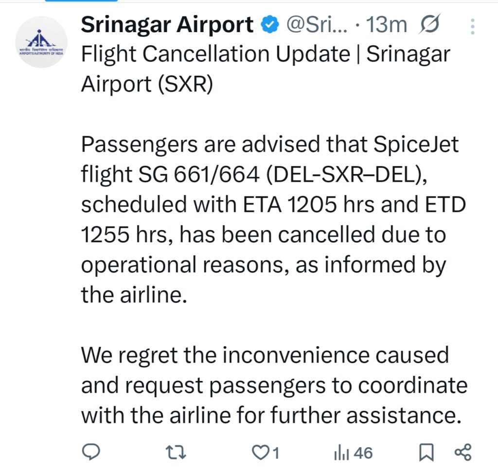SRINAGAR, Jan 11 (2026) — Authorities at Srinagar Airport have issued an official travel update regarding the cancellation of scheduled flight services.