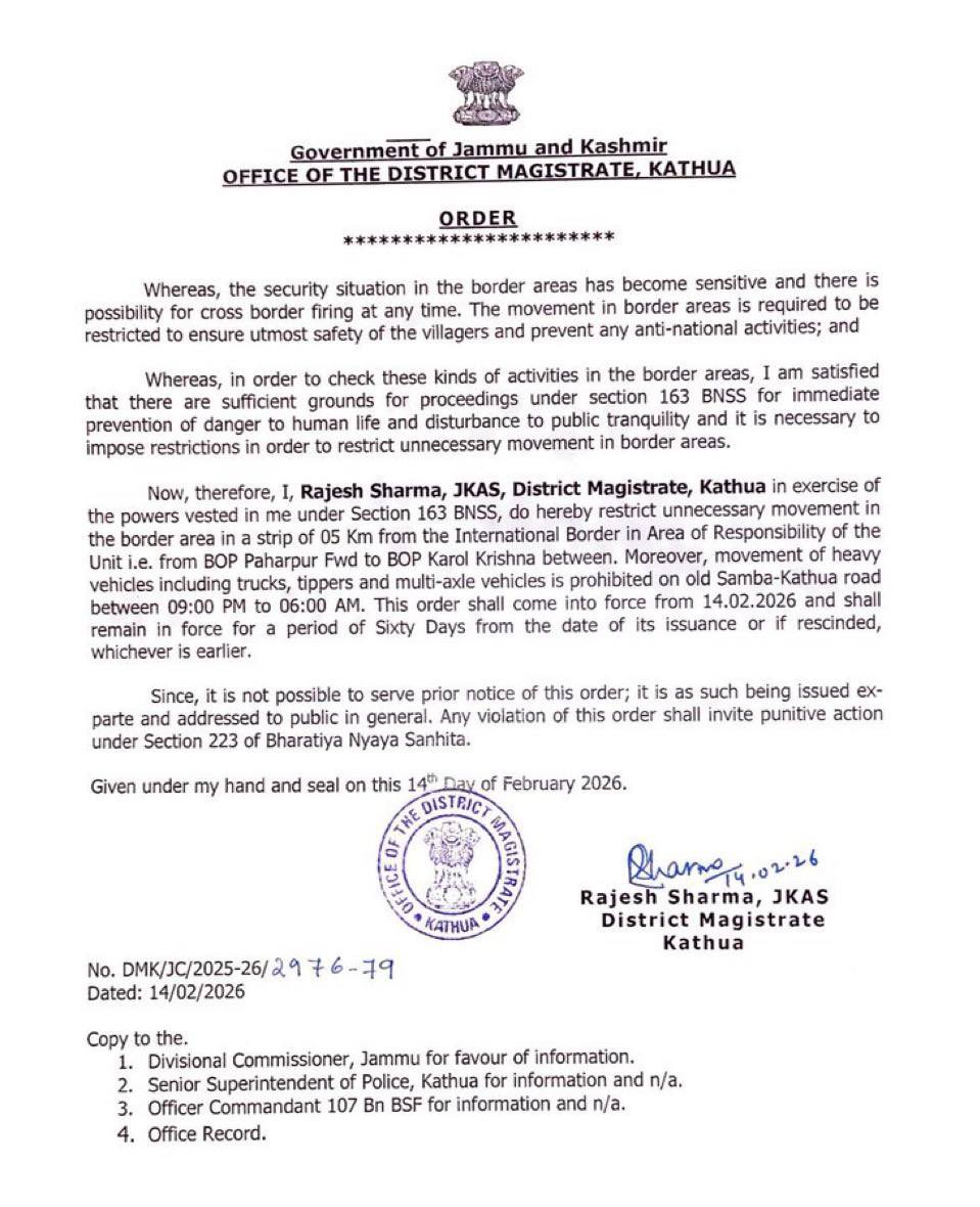 KATHUA February 14, 2026: Citing a sensitive security environment and the risk of cross-border firing, the District Magistrate of Kathua, Rajesh Sharma (JKAS), has issued an urgent order to regulate movement along the International Border.
