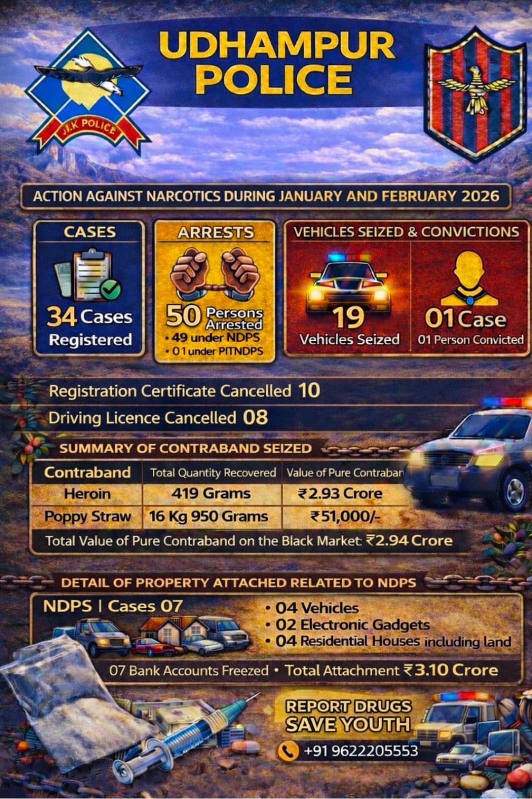 UDHAMPUR, March 01, 2026 — In a major offensive against the drug trade, the Udhampur Police have significantly intensified their district-wide operations under the Nasha Mukt Abhiyaan initiative during the first two months of 2026.