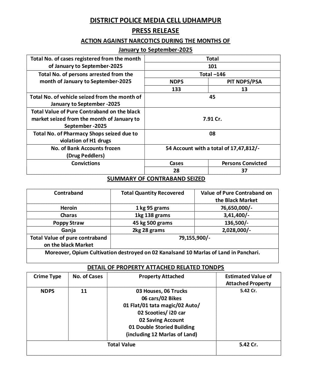 Udhampur 30th September :- Continuing its relentless action against narcotics, Udhampur Police registered 101 cases under the NDPS Act from January to September 2025. A total of 146 drug peddlers were arrested, including 133 under NDPS and 13 under PIT NDPS/PSA. 45 vehicles used in narcotic smuggling were seized, and 08 pharmacy shops were sealed for violating H1 drug norms.